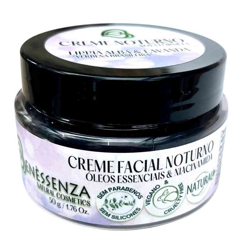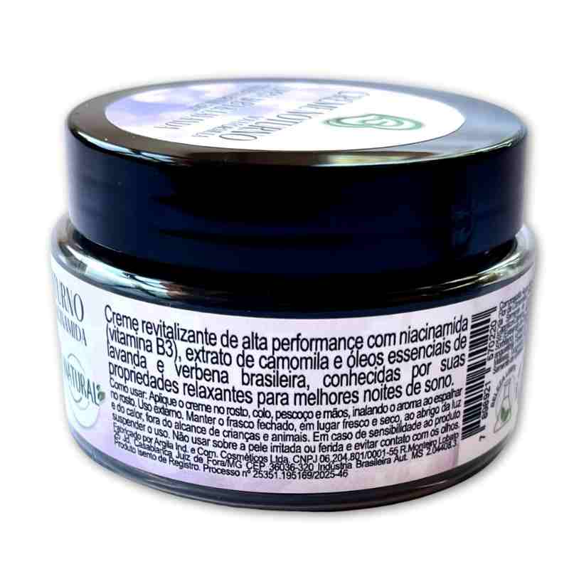 Composição Creme Noturno: Aqua (Água), Propanediol (Propanodiol), Cetyl Alcohol (Álcool Cetílico), Chamomilla recutita Flower Extract (Extrato da Flor de Camomila), Pentaclethra macroloba Seed Oil (Óleo da Semente de Pracaxi), Theobroma grandiflorum Seed Butter (Manteiga da Semente de Cupuaçu), Vitis vinifera Seed Oil (Óleo da Semente de Uva), Caprylic/Capric Triglyceride (Triglicerídeo Caprílico/Cáprico), Niacinamide (Nicotinamida), Glycerin (Glicerol), Heptyl Undecylenate (Undecilenato de Heptila), Glyceryl Stearate SE (Estearato de Glicerila Autoemulsionável), Polyglyceryl-10 Stearate (Estearato de Poliglicerila-10), Sorbitan Caprylate (Caprilato de Sorbitano), Cetearyl Olivate (Olivato de Cetearila), Sorbitan Olivate (Olivato de Sorbitano), Xanthan Gum (Goma Xantana), Lavandula angustifolia Flower Oil (Óleo da Flor de Lavanda), Benzoic Acid (Ácido Benzoico), Lippia alba Leaf Oil (Óleo de Folha/Caule de Melissa), Tocopherol (Tocoferol), Pelargonium graveolens Flower Oil (Óleo da Flor de Gerânio), Helianthus annuus Seed Oil (Óleo da Semente de Girassol), Linalool*(Linalol*), Citronellol*(Citronelol*), Geraniol*(Geraniol*).*From essential oils /*Dos óleos essenciais.